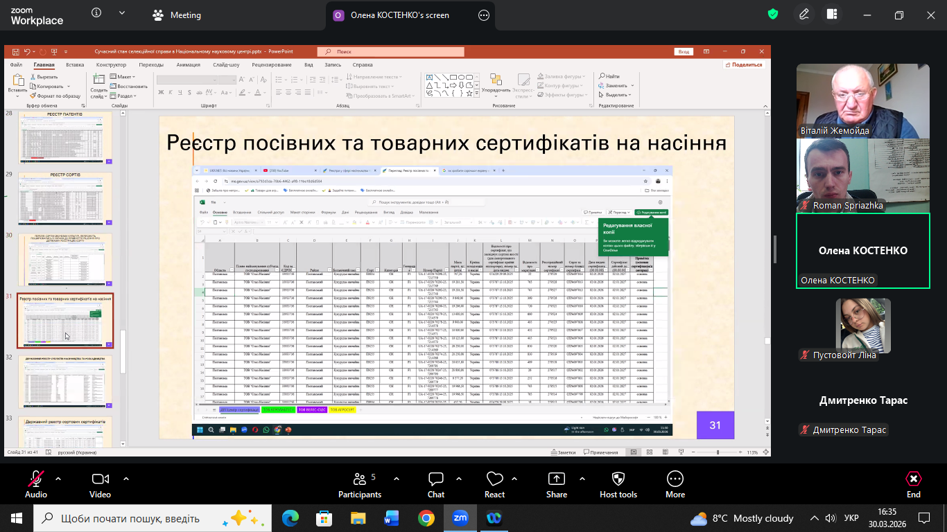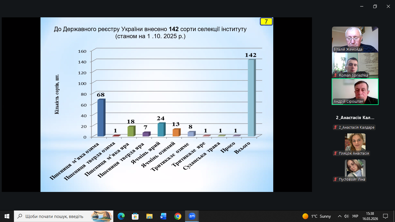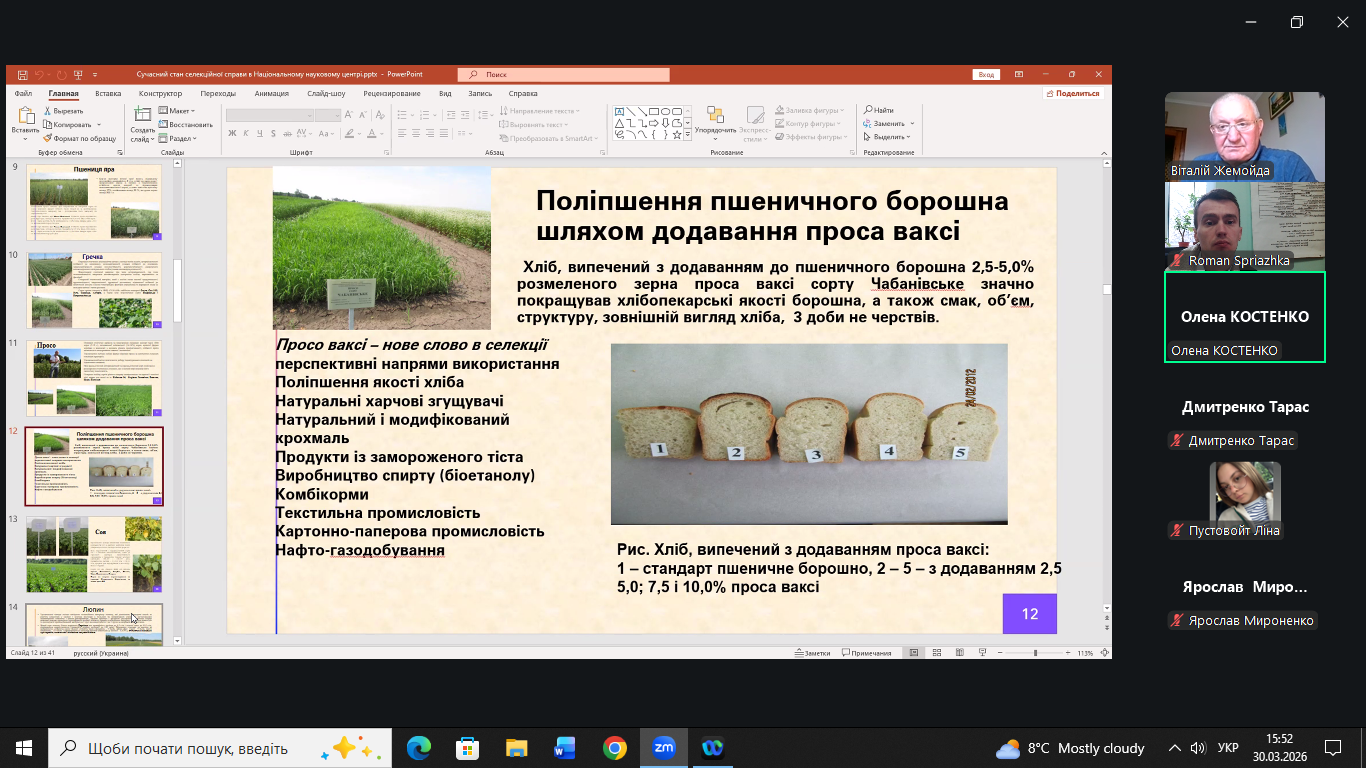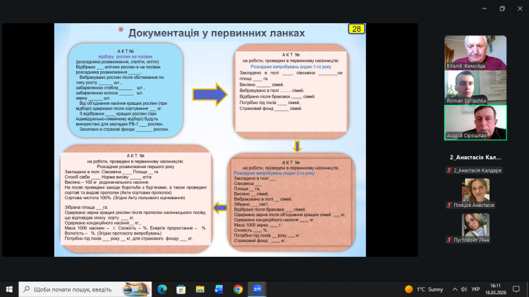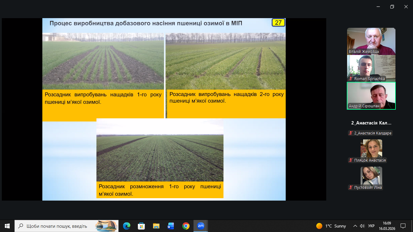 Подана інформація викликала заціакленість та спонукала до обговорення питань, що стосуються наукових напрямів селекції і насінництва як в Інституті землеробства, так і в світі загалом. Тараса ДМИТРЕНКО зацікавив напрямок використання проса при виробництві хліба, а Софія ГАВРИЛЮК звернула увагу на необхідність володіння сучасними реєстрами та базами даних для коректного проходження процедури сертифікації насіннєвого матеріалу.