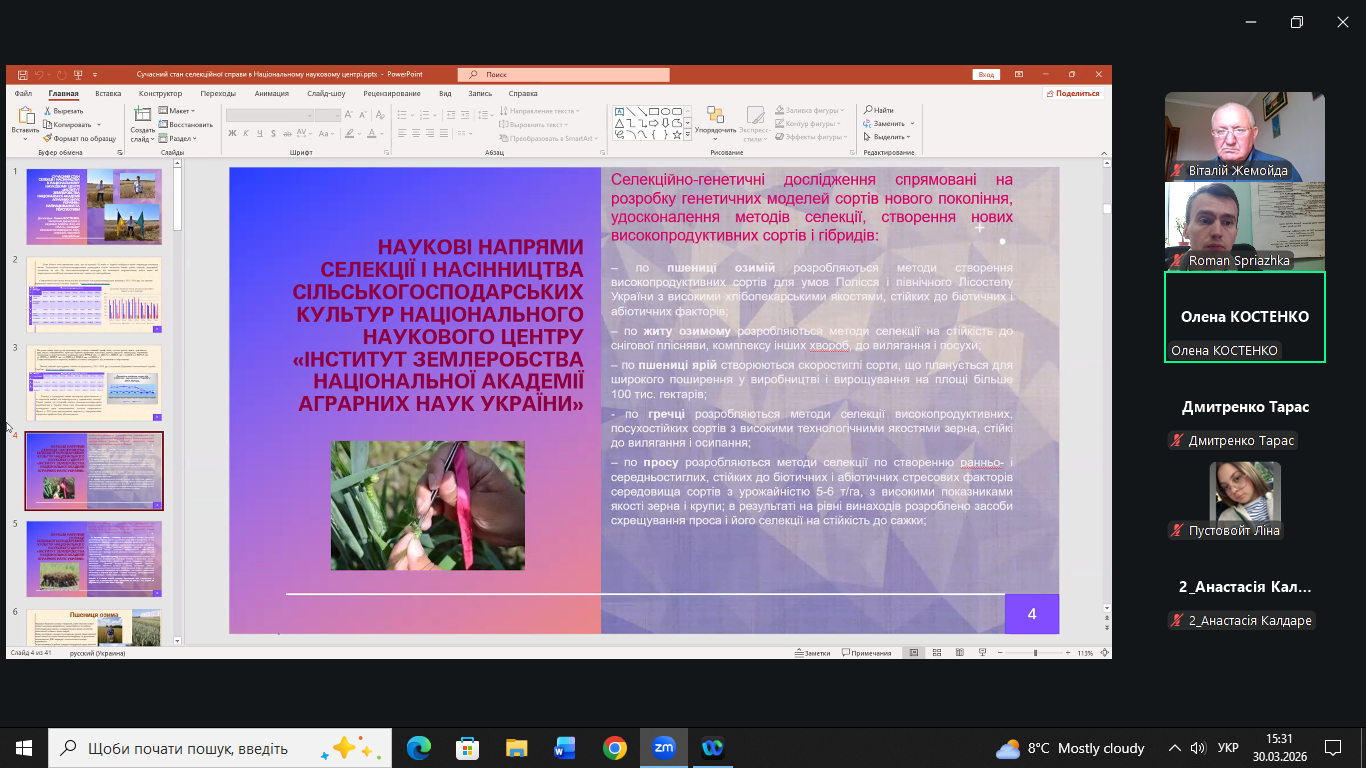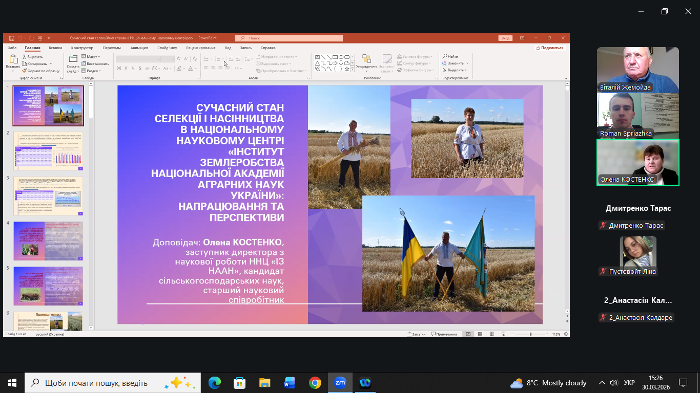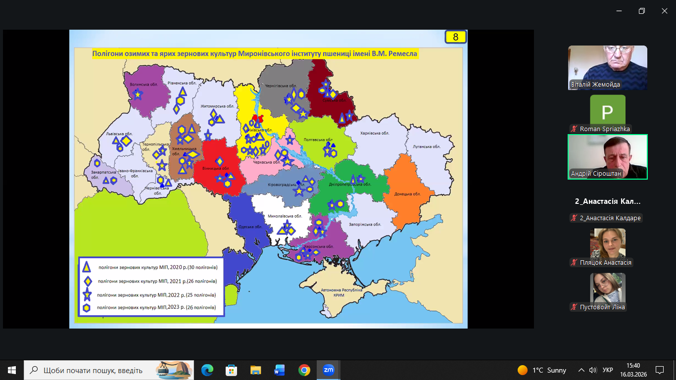 Наступна лекція була присвячена іншому науково-дослідному закладу - Інституту землеробства НААН України. Спікером виступила кандидат с.-г. наук, старший науковий співробітник, заступник директора з наукової роботи Олена КОСТЕНКО із доповіддю на тему: "Сучасний стан селекції і насінництва в Національному науковому центрі "Інститут землеробства НААН України": напрацювання та перспективи".