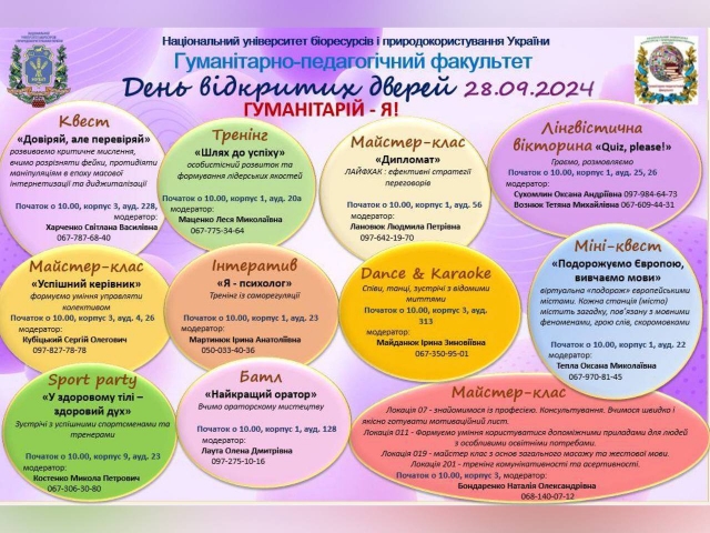 Кожна людина є унікальною, її внутрішній світ – неповторний, однак усіх українців – таких різних – об’єднує одна велика мрія про Перемогу. Це світле прагнення надихає на завзяту працю, намагання наблизити час, коли ворог не затьмарюватиме поступ нашого народу. Проте й у ту мить перед українцями постане виклик – відбудувати державу, яка сприятиме розвитку та процвітанню кожної талановитої людини. Колектив НУБіП України усвідомлює важливість освітньої процесу в часі відновлення України, тому дбає про майбутнє покоління фахівців, що приймуть відповідальність за майбутнє на себе. 28 вересня у стінах університету відбувся День відкритих дверей, до проведення якого долучився гуманітарно-педагогічний факультет.