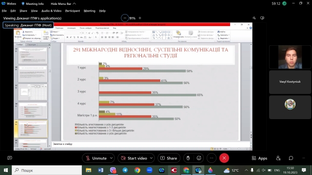 Перше питання «Про підсумки вступної кампанії 2023 року та нові горизонти профорієнтаційної роботи 2023/2024 н.р.» доповідав заступник декана гуманітарно-педагогічного факультету Богдан Назаров. Він закцентував увагу на виконанні державного замовлення та ліцензійного обсягу в 2023 році на факультеті, наголосивши на складних умовах вступу абітурієнтів та проблемах формування контингенту студентів. Незважаючи на це, на гуманітарно-педагогічний факультет зараховано 426 першокурсників (на 27 першокурсників більше проти минулого року) і 418 магістрів (на 8 більше проти минулого року). І це заслуга всього колективу факультету.