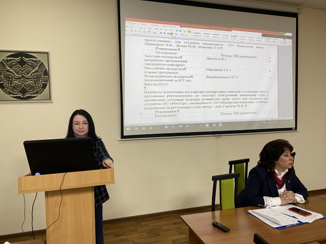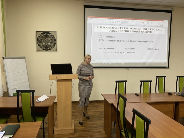 Предметом докладного розгляду були й результати проміжної атестації здобувачів вищої освіти, які проаналізувала заступник декана, кандидат історичних наук, доцент Наталія Шевченко. Вона зауважила, що відповідно до «Положення про організацію освітнього процесу в Національному університеті біоресурсів і природокористування України», проміжну атестацію проводять після вивчення програмного матеріалу кожного змістового модуля. Для успішного її проходження здобувачі освіти мають відвідувати навчальних занять, успішно виконати всі заплановані завдання та набрати необхідну кількість балів за проміжний модульний контроль. Учена рада рекомендує наставникам академічних груп поінформувати батьків студентів, у яких більше двох неатестацій з навчальних дисциплін. Крім того, учена рада ухвалили низку корегувальних і запобіжний дій для покращення результатів проміжної атестації.