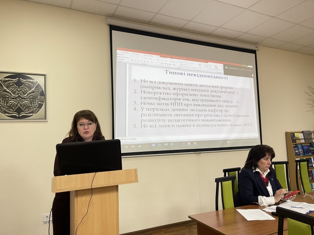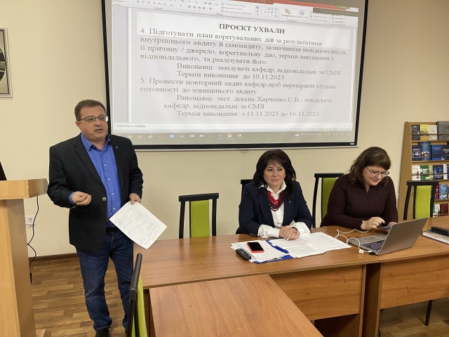 Щоб перевірити відповідність системи менеджменту якості надання освітніх послуг з вимогами внутрішніх нормативних документів НУБіП України, а також підготовки до наглядового авдиту системи управління якістю університету було здійснено внутрішній авдит СМЯ гуманітарно-педагогічного факультету. Про його результати та формування плану корегувальних і запобіжних дій доповіла заступник декана доктор філологічних наук, професор Світлана Харченко, яка виокремила типові недоліки і надала слушні рекомендації з їх усунення. Світлана Василівна відзначила «родзинки» кафедр, які було виявлено під час перевірки, їх як цікавий і вартий уваги досвід можна запозичити. Доповідачка зазначила, що найкраще до внутрішнього авдиту підготувалися кафедра психології, кафедра соціальної роботи та ребілітації, кафедра філософії та міжнародної комунікації.
