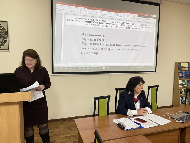 Палкі наукові дискусії викликали обговорення тем кваліфікаційних робіт здобувачів вищої освіти другого (магістерського) рівня 2023 року вступу та наукових керівників (доповідали заступник декана доктор педагогічних наук, професор Ігор Буцик та гаранти освітніх програм) і затвердження тем дисертацій здобувачів вищої освіти третього (освітньо-наукового) рівня 2023 року вступу та наукових керівників (доповідали гаранти освітньо-наукових програм, заступник декана доктор філологічних наук, професор Світлана Харченко).