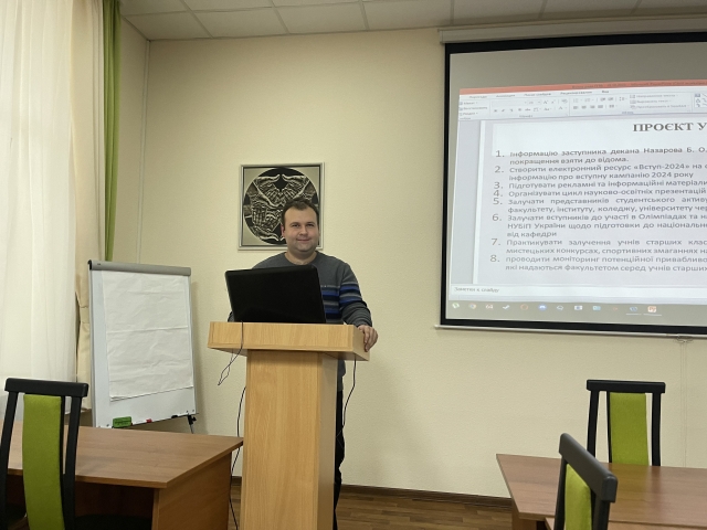 Доповідач наголосив на важливості профорієнтаційної роботи з дотриманням планомірності, системності, безперервності, а також на ролі індивідуальної профорієнтаційної роботи науково-педагогічних працівників факультету, адже вже розпочалася вступна кампанія 2024.