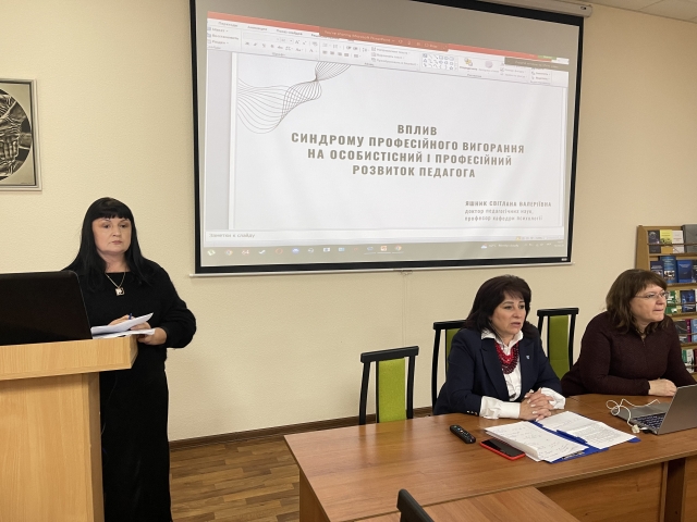 Із науковою доповіддю «Вплив синдрому професійного вигорання на особистісний і професійний розвиток педагога» виступила доктор педагогічних наук професор кафедри психології Світлани Яшник, зосередившись у виступі на мультикультурних моделях професійного вигорання, підходах до його витлумачення, а також на його ознаках. Світлана Валеріївна розповіла і про Всеукраїнську програму ментального здоров’я «Ти як?», що її зініціювала перша леді України Олена Зеленська, і про проєкт «Психосоціальна підтримка та психологічна допомога на всіх рівнях освіти», впровадженого Міністерством освіти і науки України в закладах освіти.