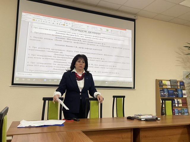 Рекомендації навчально-методичної ради гуманітарно-педагогічного факультету озвучила її голова доктор педагогічних наук, професор Світлана Амеліна. Учена рада схвалила до друку навчально-методичну і наукову літературу.
