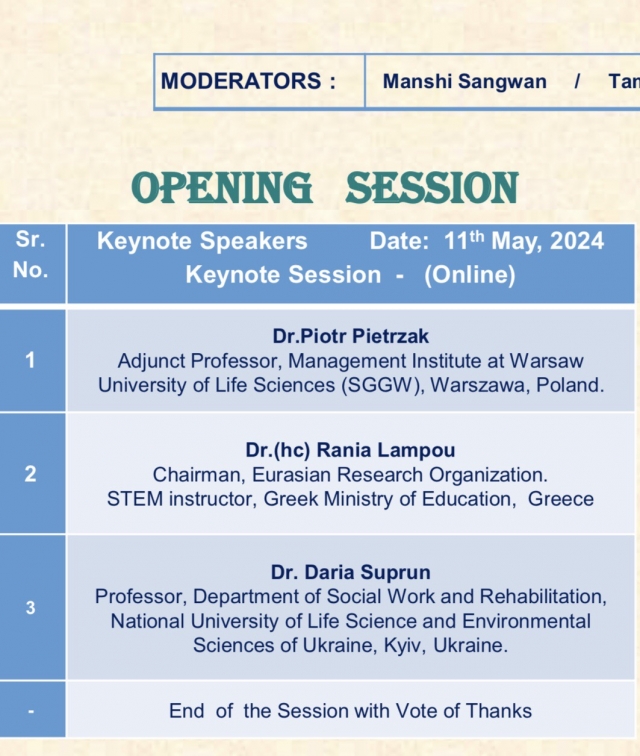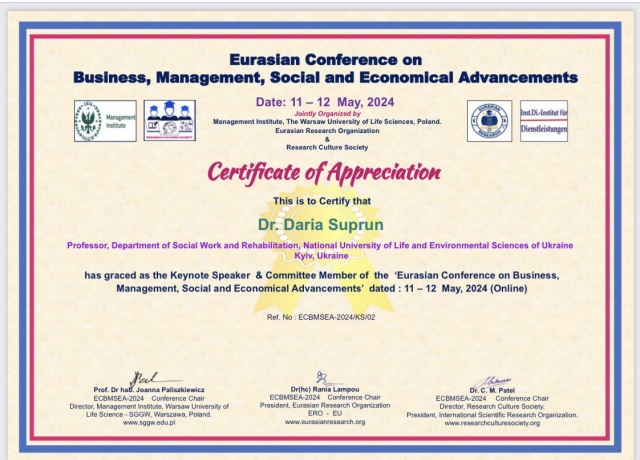 11-14 травня 2024 року кафедра соціальної роботи та реабілітації гуманітарно-педагогічного факультету Національного ун-ту біоресурсів і природокористування України долучилася до Міжнародної науково-дослідної конференції, організаторами якої є «Research Culture Society» у співорганізаторстві з Management Institute, The Warsaw University of Life Sciences, Poland; Institut für Dienstleistung, Germany; The Indian Institute of Man