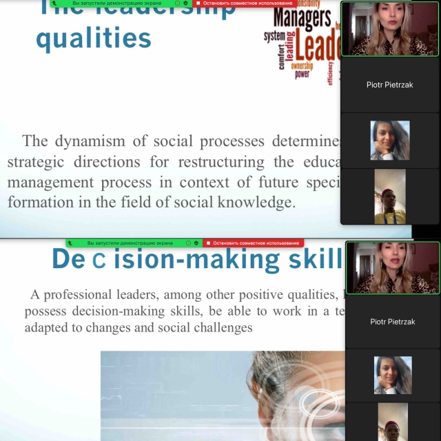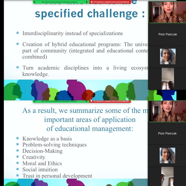 Дар’я Миколаївна у доповіді щодо питань освітнього менеджменту зазначила, що серед пріоритетних завдань, визначених тенденціями міжнародної інтеграції, представлені актуальні питання оновлення змісту професійної підготовки, реструктуризації освіти, трансформації гуманітарної освіти, впровадження інноваційних технологій підготовки конкурентоспроможних фахівців. В умовах даної інеграції для України видається необхідним вивчення передового світового досвіду. Входження в світову спільноту модернізації міжнародного порядку в контексті визначених пріоритетів майбутнього світоустрою вимагає від вищої освіти поетапно реалізовувати складові наявної мегасистеми цілісного освітнього простору, де прикметною ознакою її змісту є розбудова професійної підготовки фахівців на компетентнісно-орієнтованій основі в умовах впровадження новітніх форм навчання.