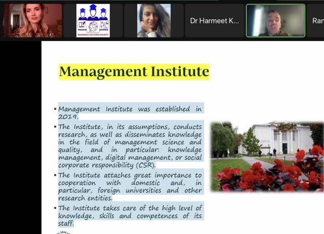 agement and Commerce(IIMC), Osmania University, India; Jharkhand Rai University, India. Професор кафедри, доктор педагогічних наук, Дар’я Супрун, яка є членом «Research Culture Society», на запрошення Комітету виступила Запрошеним Ключовим Спікером на пленарному засіданні та представила результати проведеної роботи у доповіді “EDUCATIONAL MANAGEMENT: MAIN ASPECTS OF DECISION-MAKING”.
