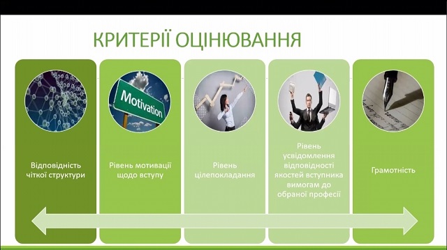 Тому проєктна команда, ретельно вивчивши досвід інших закладів щодо проведення подібних тренінгів, запропонувала своє бачення. Ідея полягала в тому, аби стисло, в межах часу шкільного уроку (бо більше 45 хвилин сучасній молоді важко концентрувати увагу) та обов’язково з прикладами показати, як виглядає вже готовий мотиваційний лист, з яких частин він складається та що, власне може бути тим мотивуючим фактором, який «вистрелить» і за який члени комісії оберуть саме цього, а не іншого абітурієнта.