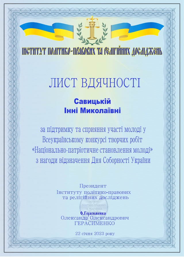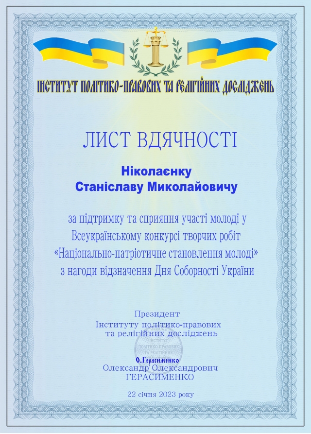 Організатори Конкурсу висловлюють слова вдячності ректору НУБіП Станіславу Миколайовичу Ніколаєнку та декану гуманітарно-педагогічного факультету Інні Миколаївні Савицькій за сприяння участі молоді у Всеукраїнському конкурсі творчих робіт "Національно-патріотичне становлення молоді", приуроченого до Дня Соборності України.