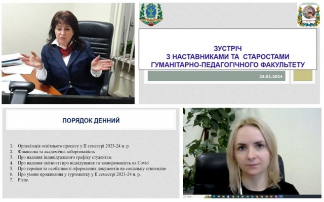 З новими силами, планами та ідеями розпочинають новий навчальний семестр на гуманітарно-педагогічному факультеті. 25 січня 2024 року адміністрацією факультету було проведено онлайн-зустріч з наставниками та старостами академічних груп, на якій розглядалися актуальні питання організації освітнього процесу.
