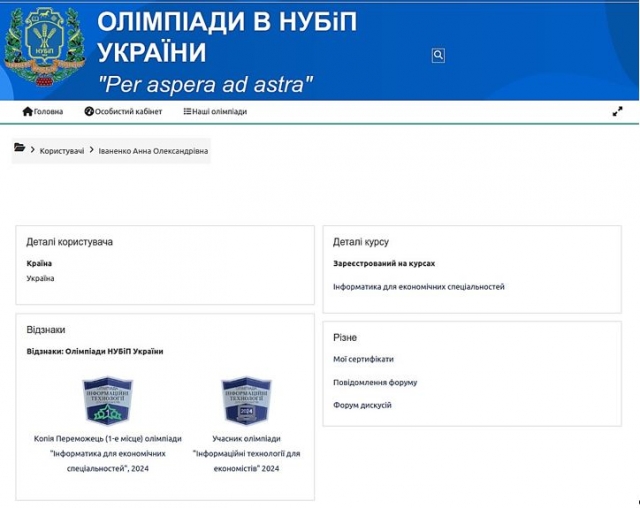 Для проведення олімпіади, яка проводилась цього року дистанційно, було створено електронний навчальний курс (https://olympus.nubip.edu.ua/course/view.php?id=25), з можливістю самореєстрації студентів, здійснено розсилку запрошень учасникам та забезпечено онлайн підтримку основних процесів проведення олімпіад від реєстрації учасників до «видачі» відзнак та дипломів.