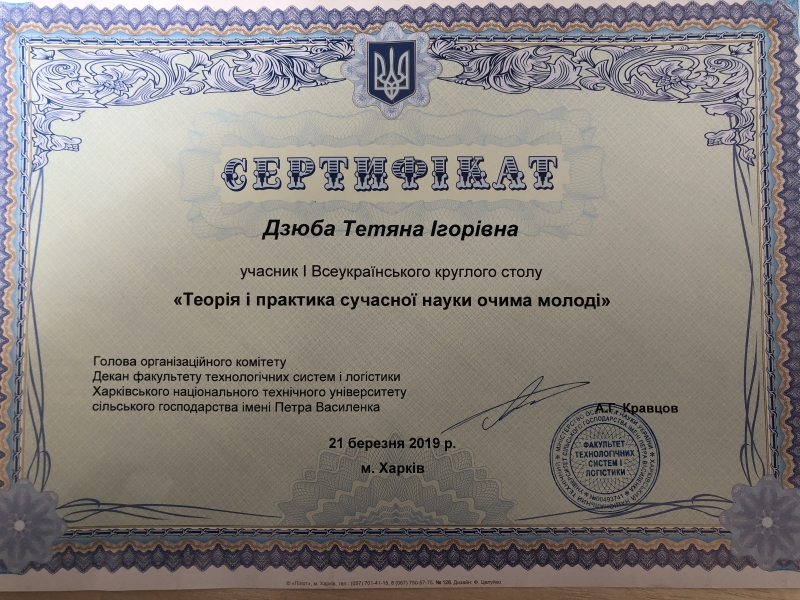 21 березня аспірант кафедри статистики та економічного аналізу Дзюба Т.І. прийняли участь у І Всеукраїнському круглому столі «Теорія і практика сучасної науки очима молоді», який відбувся на базі факультету технологічних систем і логістики Харківського національного технічного університету сільського господарства ім. Петра Василенка за ініціативи декана факультету Кравцова А.Г. та завідувача кафедри агрологістики та управління ланцюгами постачань Ларіної Т.Ф.