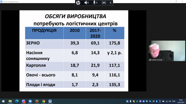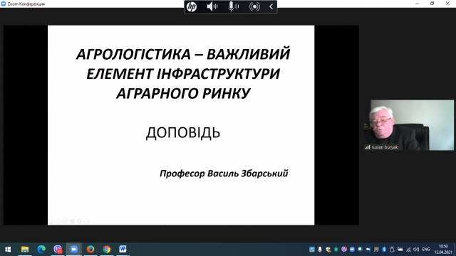 Професор кафедри маркетингу та міжнародної торгівлі Василь Збарський у доповіді «Агрологістика – важливий елемент інфраструктури аграрного ринку» звернув увагу на особливості розвитку та проблеми функціонування агрологістики, які пов’язані із недостатністю рухомого складу і вагонів-хоперів для транспортування зерна, наявності малодіяльних станцій, зношення залізничних колій, незадовільному стану автомобільних доріг та перевантаженості автомобільних транспортних засобів.