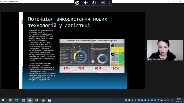 Професор кафедри менеджменту ім. проф. Й.С. Завадського Надія Резнік зупинилася на основних цифрових логістичних трендах, особливого зростання які набули в умовах пандемії COVID-19, посиленні цифровізації, використанні хмарних технологій та штучного інтелекту у прийнятті логістичних рішень.