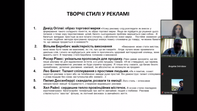 Важливим аспектам розвитку реклами в сучасних умовах та використання творчих стилів у рекламній діяльності була присвячена доповідь професора кафедри маркетингу та міжнародної торгівлі Олександра Луція.