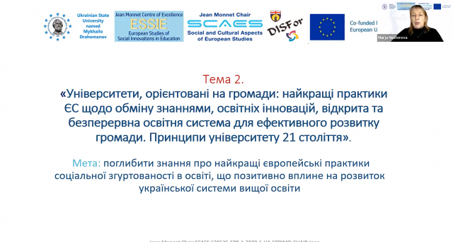 16-28 січня 2023 року відбулася Зимова школа, яка проводилася в рамках імплементації проєкту Кафедра Жана Монне «Соціальні та культурні аспекти Європейських Студій»(SCAES) - 620635-EPP-1-2020-1-UA-EPPJMO-CHAIR та Центру Досконалості Жана Монне «Європейські Студії соціальних інновацій в освіті» (ESSIE) - 101085552 - ERASMUS-JMO-2022-COE.