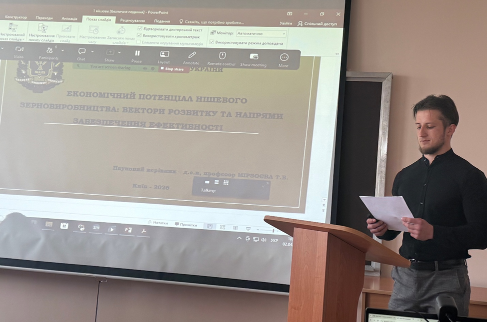 У ході доповіді здобувач окреслив сутність нішевих зернових культур, представив характерні тенденції їхнього виробництва в Україні, розкрив тенденції експорту імпорту, а також окреслив можливі напрямки підвищення економічної ефективності їх виробництва. По завершенню доповіді слухачі активно задавали запитання і відбулося конструктивне обговорення представленого матеріалу.