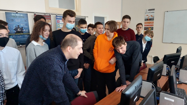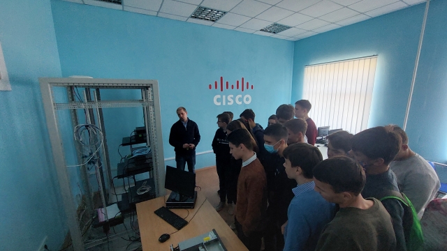 Проте, яка екскурсія, коли зустрічаються професіонали і ті, хто прагне ними стати? Тож в аудиторіях, де розміщено для навчання студентів відповідне обладнання компанії Cisco та навчальний кіберполігон, Андрій Блозва провів для учнів короткий майстер-клас із забезпечення кібербезпеки на апаратному та програмному рівні.