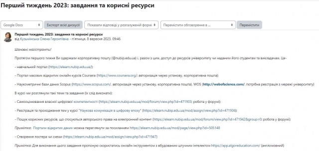 Інше питання, яке неможливо оминути при «знайомстві» з університетом та технологіями, це питання академічної доброчесності. Саме тому тема авторських прав на цифровий контент, відповідних ліцензій та джерельної бази була також затребуваною серед студентів. І форми роботи з опрацювання цієї теми були сучасними: обговорення в форумі, аналіз запитів до на базі ChatGPT, створення постерів та інтерактивних схем із застосуванням інструментів із вбудованим штучним інтелектом. Разом з тим, важливо не лише опановувати нові інструменти та технології, але й розвивати критичне мислення, оскільки прийняття рішення завжди залишається за людиною.