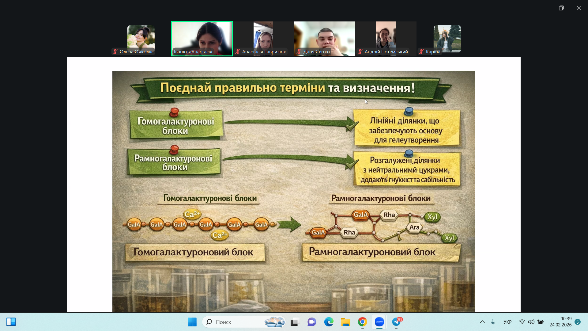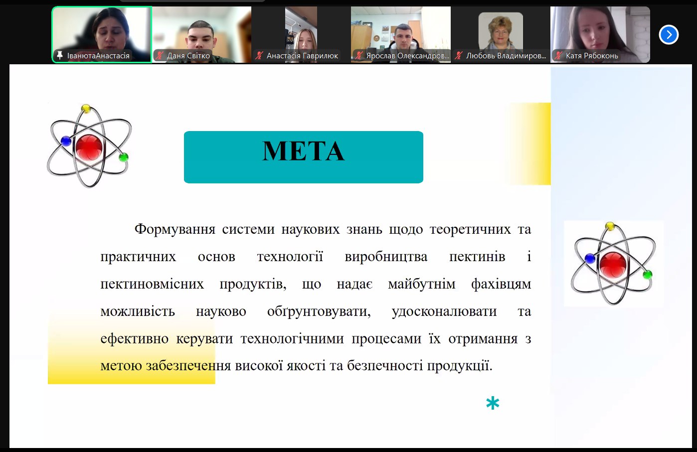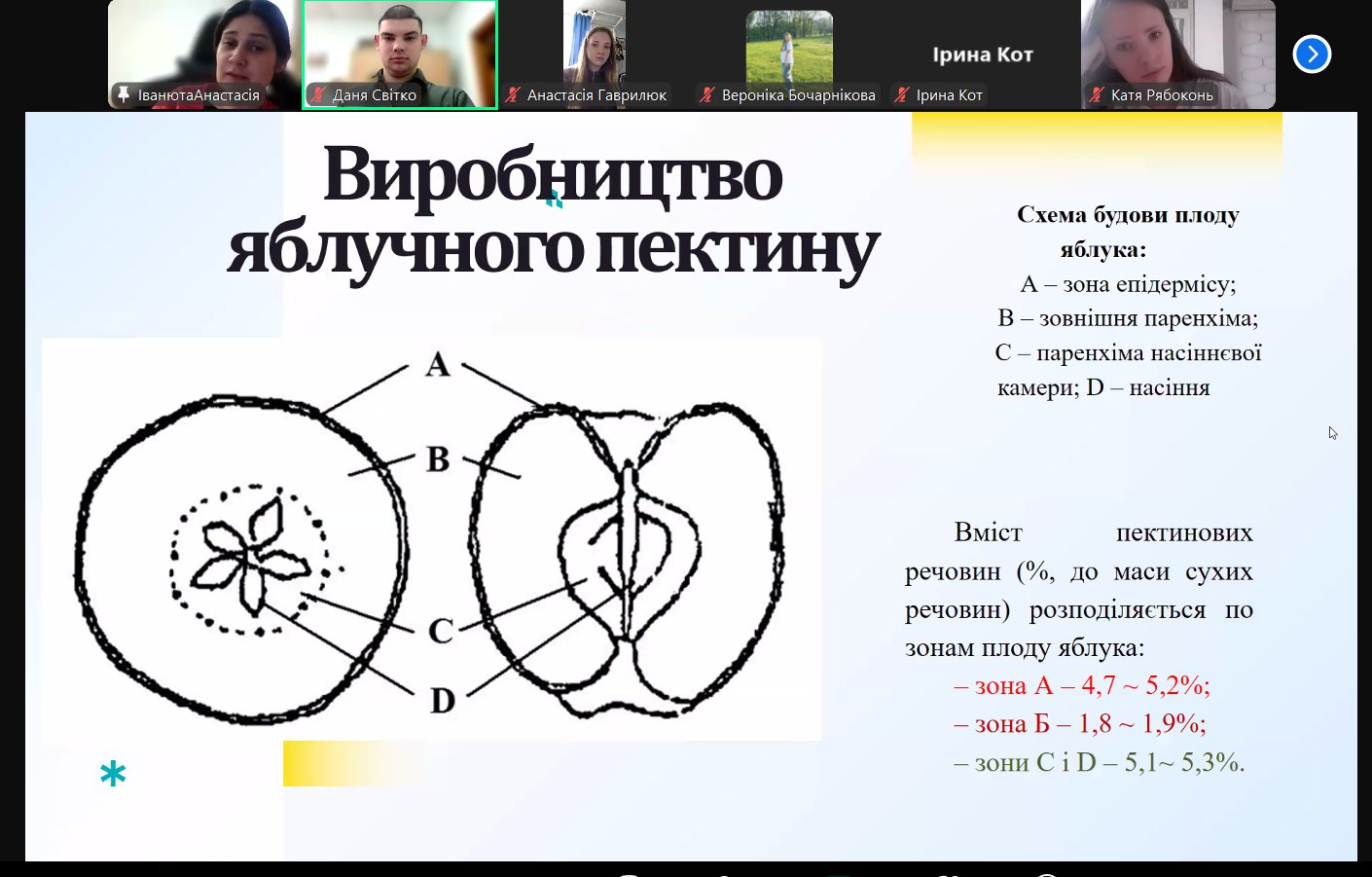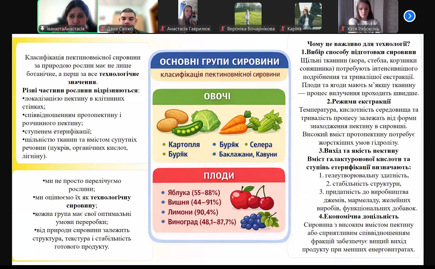 У межах лекції студенти ознайомилися з будовою та фізико-хімічними властивостями пектинових речовин, основними сировинними джерелами їх отримання, етапами технологічного процесу та показниками якості пектину відповідно до чинних нормативних вимог.