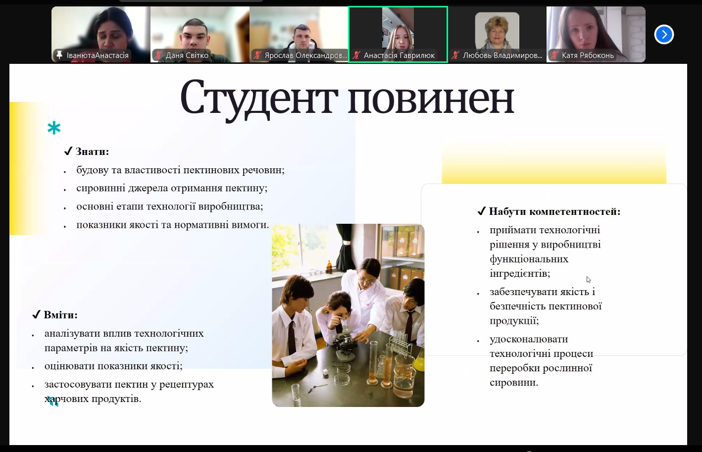 Особливу увагу приділено формуванню практичних умінь: студенти навчалися аналізувати вплив технологічних параметрів на якість пектину, оцінювати його фізико-хімічні та функціональні властивості, а також застосовувати пектин у рецептурах харчових продуктів з урахуванням його стабілізуючих і структуроутворювальних властивостей.
