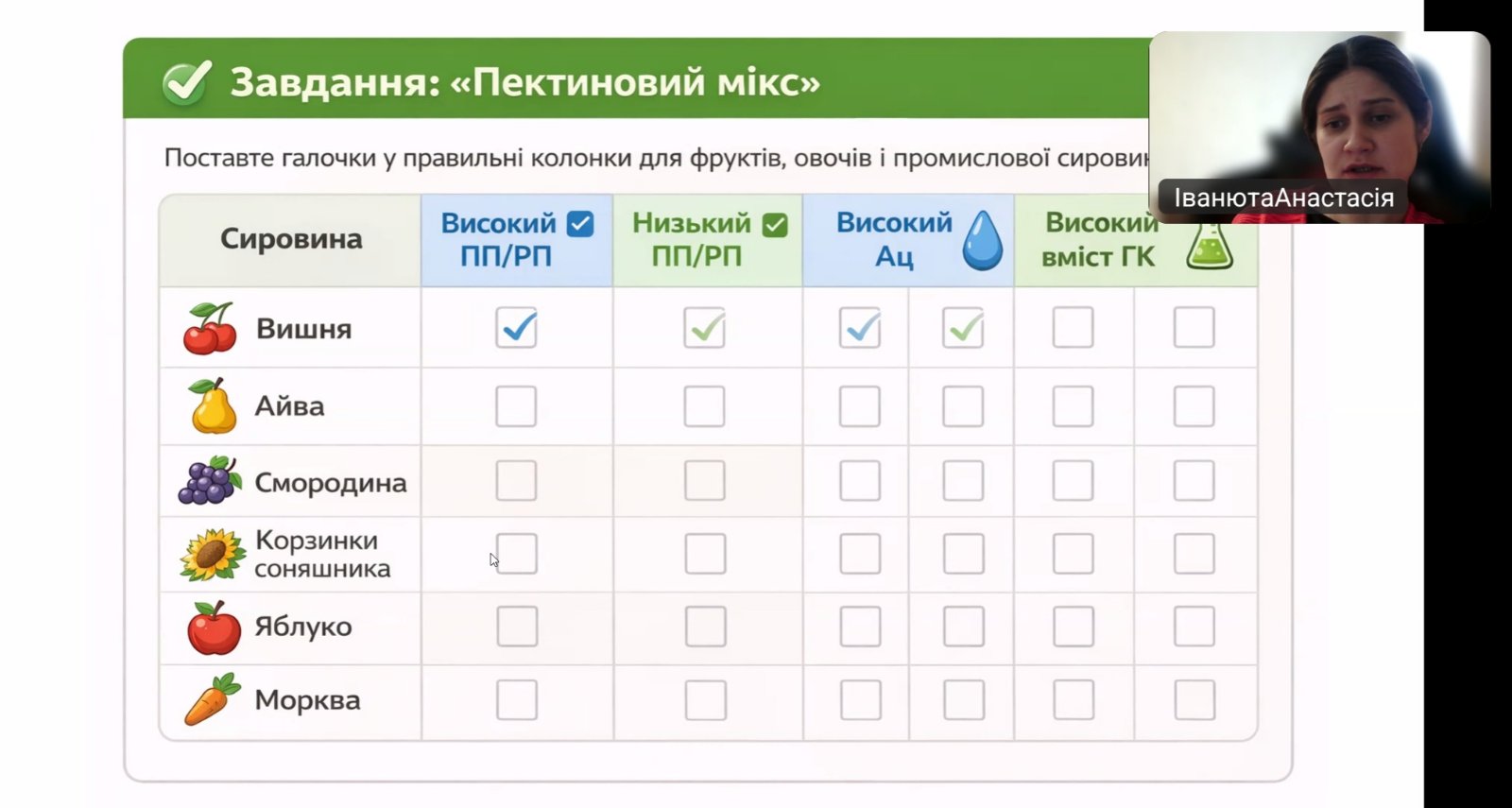 Лекція розпочалася з чіткого визначення мети та завдань заняття, що полягали у формуванні системи наукових знань щодо теоретичних і практичних основ технології виробництва пектинів та пектиновмісних продуктів. Лектор акцентувала увагу на тому, що ці знання надають майбутнім фахівцям можливість науково обґрунтовувати технологічні рішення, удосконалювати процеси отримання пектину та ефективно керувати ними з метою забезпечення високої якості та безпечності продукції.