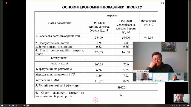 Варто звернути увагу на те, що деякі з представлених дипломних проектів бакалавра мають практичну цінність для сучасного розвитку агропромислового комплексу держави, результати технічних рішень яких можна впроваджувати на провідних аграрних підприємствах України. Серед таких напрацювань слід відзначити роботи Марії Микитюк з модернізацією роторної косарки при збиранні трав на сіно, Івана Бондара з удосконаленням скреперного транспортера на тваринницькій фермі та Андрія Делейчука з удосконаленням робочого органу картоплекопача. Підводячи підсумки заходу слід зазначити, що дистанційний варіант захисту дипломних проектів чи випускних робіт – цілком зручний. Суттєві проблеми із зв’язком були відсутні, натомість, була чітка візуалізація здобувачів освітнього ступеня, членів комісії та гостей, які приєдналися до online - захисту за посиланням, розміщеним у загальному доступі, на сайті факультету.