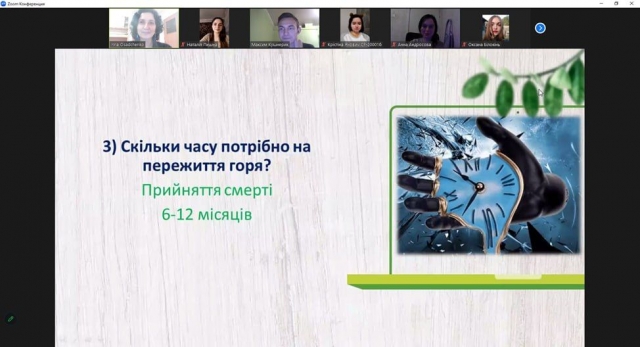 Так, кілька останніх засідань присвячені складній, але, на жаль, актуальній темі: «Проблема втрати близької людини: як допомогти пережити горювання?». На слайдах – тільки окремі питання теми: «Скільки часу потрібно на пережиття горя?», «Як перестати горювати?».