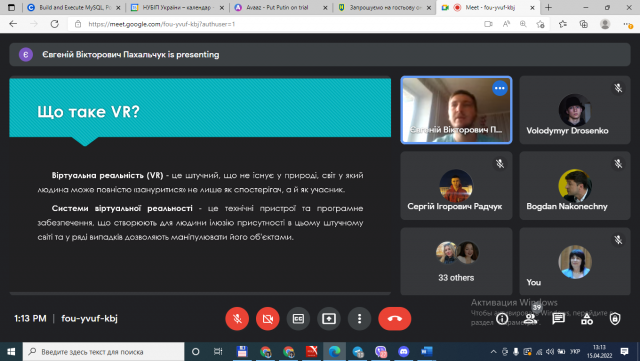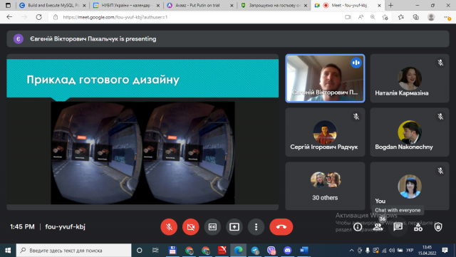 По завершенні лекції лунало чимало питань від слухачів, на які Євгеній Вікторович надав ґрунтовні відповіді. Цікаві питання, партнерське обговорення, пропозиції від викладачів та студентів зробили цю лекцію корисною та такою потрібною в наш надскладний час. Одне із запитань стосувалося можливості викладання дисципліни, пов’язаної з проектуванням та створенням систем віртуальної реальності. Ми обов’язково приймемо це до уваги та запропонуємо у вибірковій складовій для студентів.