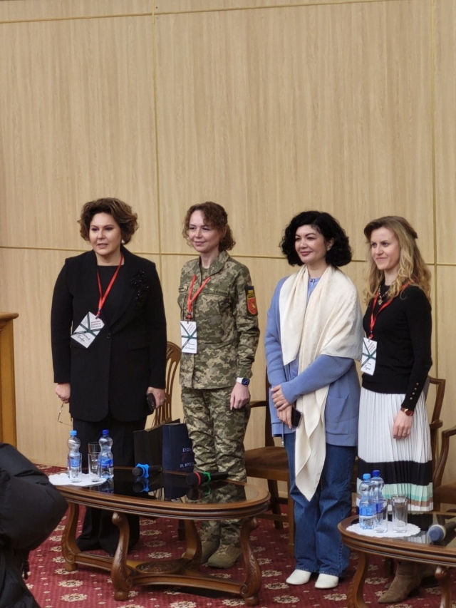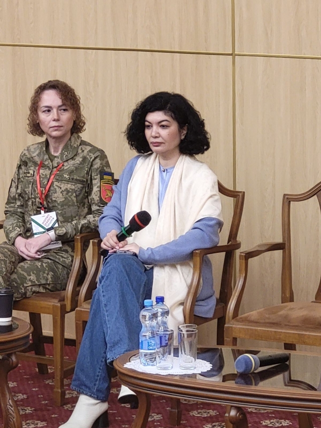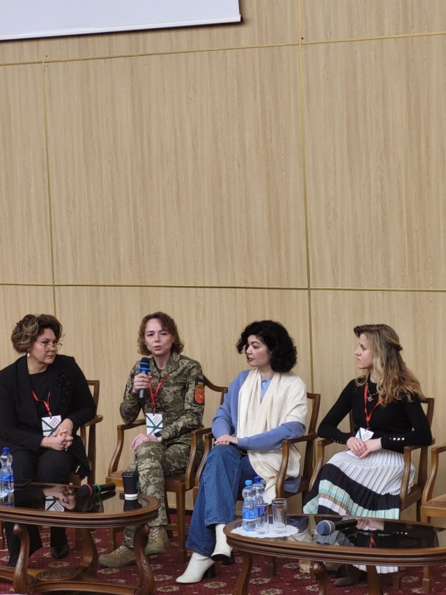 Наталія ЛИТВИНЕНКО, радниця з гендерної політики, начальниця кафедри ГІСТ військового факультету сил підтримки та забезпечення Військового інституту КНУ імені Тараса Шевченка проінформувала про існуючі стереотипи щодо гендерних ролей, але нинішнє покоління -інше, дівчата свідомо вибирають в університеті військову підготовку; в ЗСУ на даний момент понад 62 тис.жінок і , зі слів Наталії - вважається, що жінка -снайпер є потужнішою.