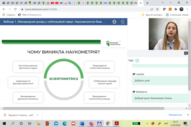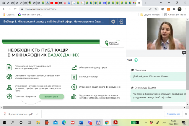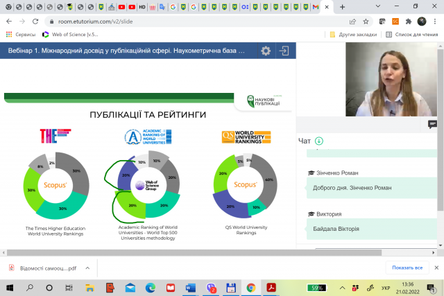 Сьогодні 21.02.2022 р. розпочав свою роботу дводенний вебінар, присвячений роботі з наукометричними базами Scopus та Web of Sciences, який проходить на порталі eTutorium.