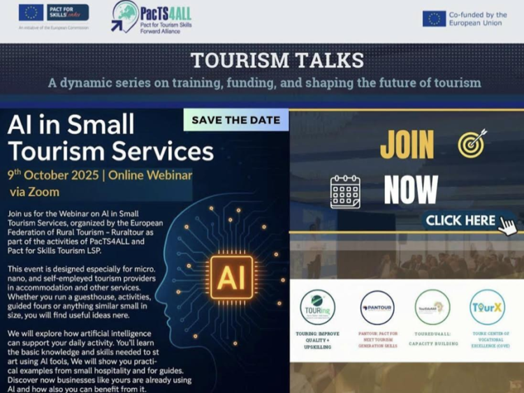 У жовтні 2025 року науково-педагогічні працівники кафедри готельно-ресторанної справи та туризму Економічного факультету НУБіП України та здобувачі вищої освіти спеціальностей J2 «Готельно-ресторанна справа та кейтеринг», J3 «Туризм та рекреація» 3 курсу брали участь в онлайн-вебінарі «ШІ в туристичних послугах», організованому Європейською федерацією сільського туризму Ruraltour у межах ініціатив PacTS4ALL та Pact for Skills Tourism LSP та розробленому для мікро-, нано- та само зайнятих провайдерів туристичних послуг у сфері розміщення та суміжних сервісів.
