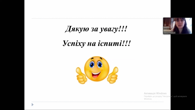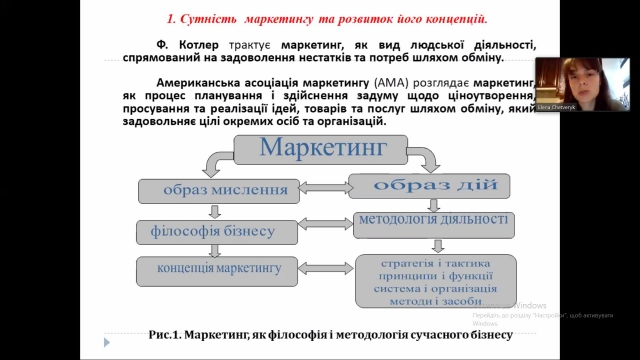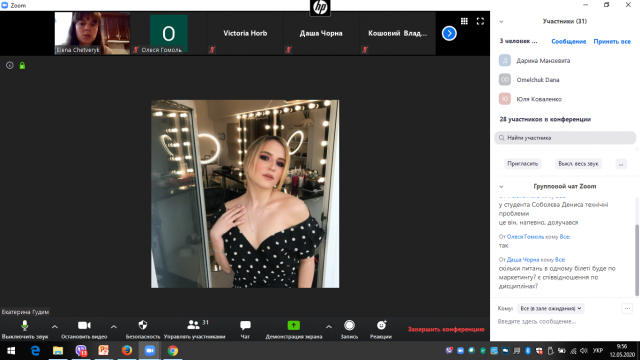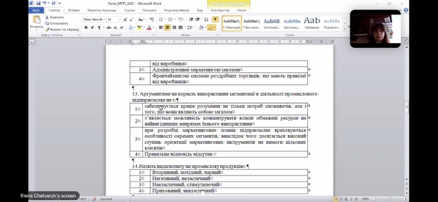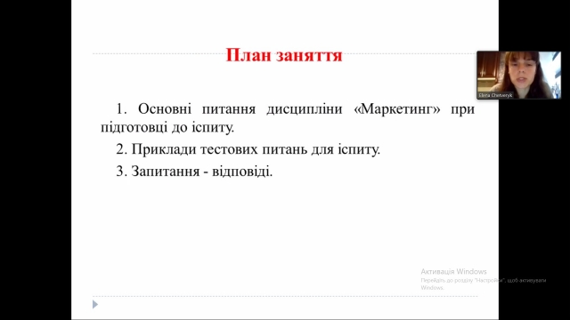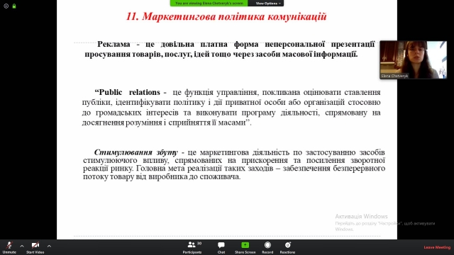 Відповідно до затвердженого графіка консультацій з підготовки до комплексного іспиту з фахових дисциплін доцент кафедри маркетингу та міжнародної торгівлі в он-лайн форматі (за допомогою програми Zoom) Четверик Оленою Вікторівною на 1 парі провела консультацію з дисципліни «Маркетинг» для студентів 4 курсу спеціальності «Менеджмент» денної форми навчання. На консультації було зазначено основні питання, які включено до циклу підготовки комплексного фахового іспиту. Відповідно до вказаного переліку питань в тезисній формі розглянуто лекційний та практичний матеріал, разом зі студентами було розв’язано орієнтовні приклади тестових завдань та надано відповіді на питання, які студенти задавали в чаті дискусії та особисто.