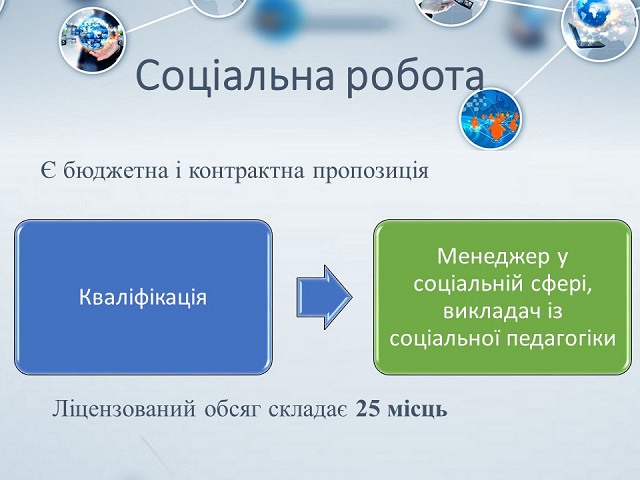 • перевіреній часом класичній програмі, збагаченій численними психолого-педагогічними знахідками та сучасними навчальними дисциплінами програмі «Соціальна робота», головне завдання якої «прокачати» менеджерські характеристики майбутнього соціального працівника.