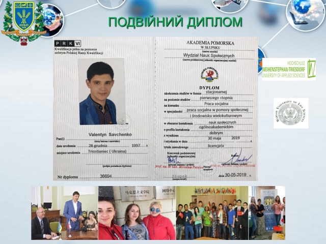 Крім того, гуманітарно-педагогічний факультет НУБіП України надає магістрам денної форми навчання можливість навчатись за програмою подвійних дипломів в Поморській академії (м. Слупськ, Польща). У ці дні узгоджуються угоди з польськими колегами, згідно яких наші магістри матимуть змогу одночасно зі знаннями і дипломом державного зразка, здобутим в НУБіП, отримати диплом закордонного зразка за однією з чотирьох галузей знань: