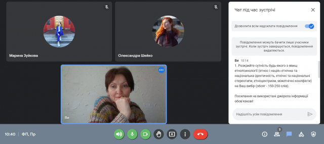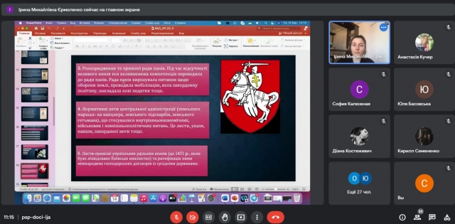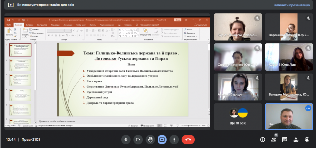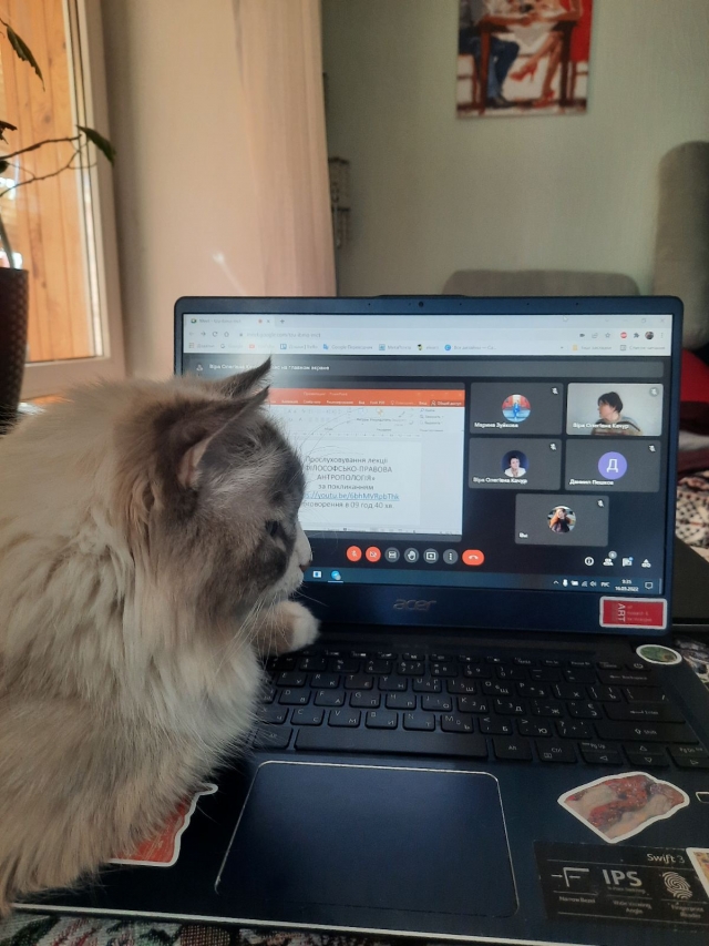 Зазначимо, що багато занять з ОК кафедри набули нового сенсу, особливо з історії держави і права України, філософії права, правової культури особистості, юридичної деонтології. Наприклад, сьогодні лекцією з філософсько-правової антропології заслухався навіть кіт Бернард Олександрович, а магістри першого року навчання отримали можливість по-новому глянути на національну ідентифікацію, національні стереотипи в контексті претензій окупанта щодо «денацифікації».