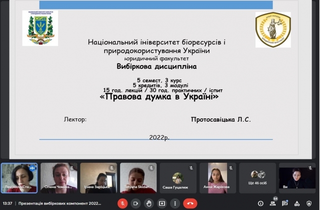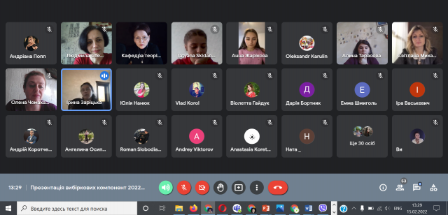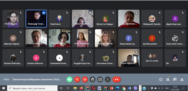 Тож 15 лютого 2022 року на виконання цього припису кафедра теорії та історії держави і права провела онлайн зустріч зі студентами та студентками 2 курсу, адже з 14 лютого стартував вибірковий процес. Викладачі кафедри ТІДП розповіли присутнім про ті вибіркові компоненти, які кафедра пропонує для них у наступному 2022/2023 н.р.