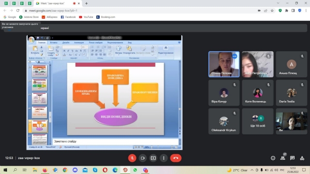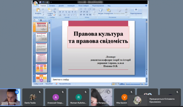 25.08.22 р. доцентка кафедри теорії та історії держави і права Олена Попова провела відкрите лекційне заняття з дисципліни «Правова культура особистості» на тему «Правова культура та правова свідомість» для студентів 4 курсу спеціальності «Технологія виробництва і переробки продукції тваринництва» у дистанційному форматі.