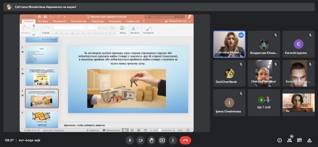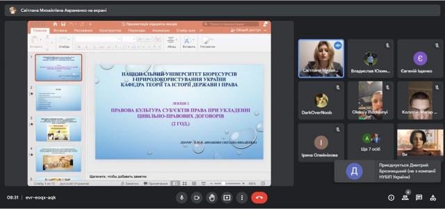 Кафедра теорії та історії держави і права розпочала ранок у звичному робочу режимі і встигла провести відкрите заняття з навчальної дисципліни «Правова культура особистості» для студентів 1 рівня вищої освіти факультету землевпорядкування. Лекторка Світлана Авраменко запропонувала сьогодні студентству лекцію на тему: «Правова культура суб’єктів права при укладенні цивільно-правових договорів».