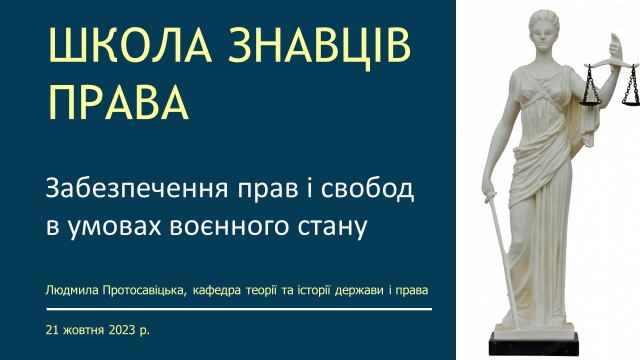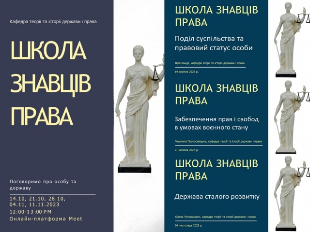 Триває другий рік війни. Увага наукової спільноти спрямована на висвітлення проблем правового регулювання в умовах воєнного стану та на повоєнний період. Але є сфера суспільного життя, яка постійно перебуває у полі зору держави і є актуальною як у воєнний період, так і в мирні часи. Цю сферу не можна врегулювати безпосередньо правовими нормами, її можна лише виплекати. І це - правова культура суспільства загалом та її членів зокрема. Тому кафедра теорії та історії держави і права продовжує реалізовувати свій просвітницький проєкт «Школа знавців права», розпочатий восени 2021 р. 14 жовтня 2023 р. стартувала осіння сесія онлайн-вебінарів, об’єднаних темою взаємовідносин особи та держави.