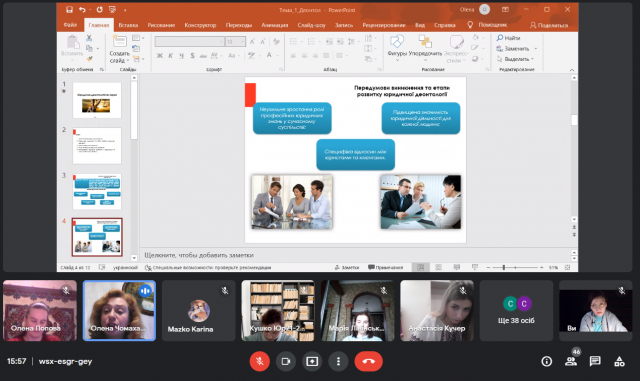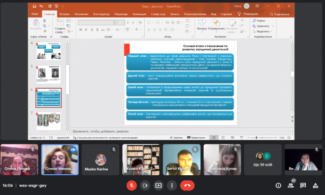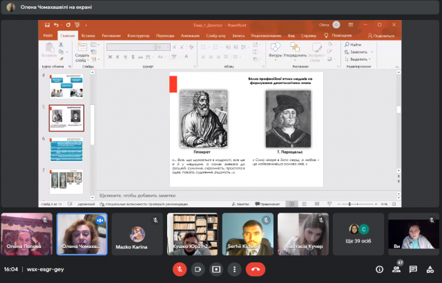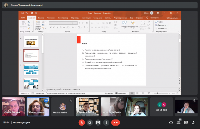 Весняний цикл відкритих лекційних занять, який було обговорено і схвалено на засіданні кафедри теорії та історії держави і права від 13 січня 2022 р. успішно стартував сьогодні, 16 лютого. Розпочала його доцентка Олена Чомахашвілі темою "Юридична деонтологія: поняття, предмет та місце і системі правознавства" (навчальна компонента «Юридична деонтологія») для студентів 1 курсу юридичного факультету.