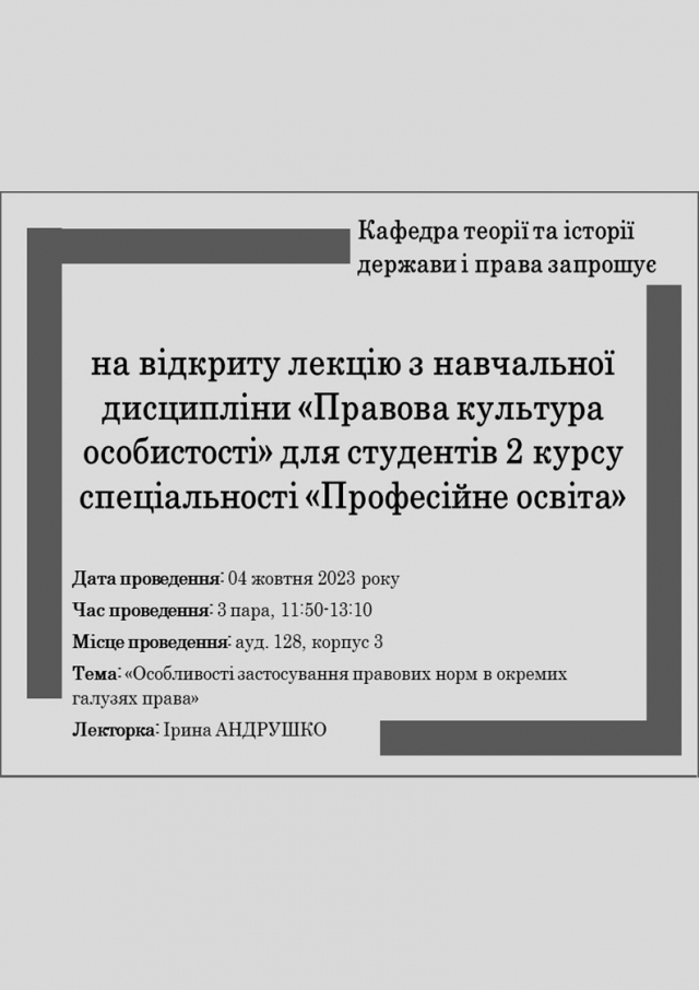 Цього тижня кафедра теорії та історії держави і права провела останню заплановану відкриту лекцію в осінньому семестрі 2023/2024 навчального року. 4 жовтня 2023 року Ірина Андрушко прочитала лекцію з навчальної дисципліни «Правова культура особистості» на тему «Особливості застосування правових норм в різних галузях права» для студентів 2 курсу гуманітарно-педагогічного факультету (спеціальність «Професійна освіта») у змішаному форматі.