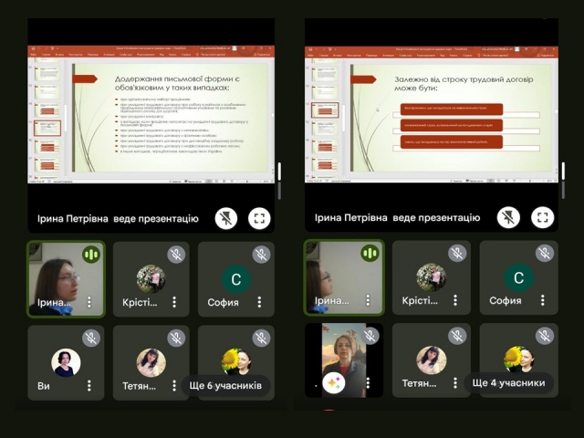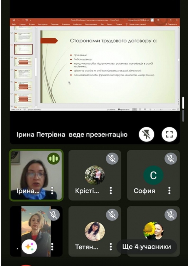 Лекторка ознайомила студентів з теоретичними та практичними аспектами правової культури учасників трудових відносин. Значну увагу було приділено написанню правових документів у цій сфері. Зокрема, про вимоги до структури та змісту закону та підзаконного нормативно-правового акту, а також судового рішення, порядок укладення трудового договору, а також особливості написання резюме, автобіографії, рекомендаційного листа та проведення співбесіди (інтерв’ю) при влаштуванні на роботу, враховуючи і особливості організації трудових відносин в умовах воєнного стану.