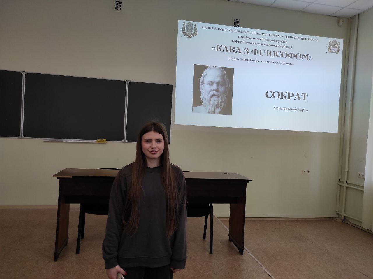 Лукашенко Вікторія інтерпретувала образ Платона, зацікавивши слухачів його вченням про світ ідей, справедливість та природу знання.