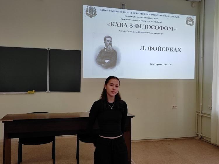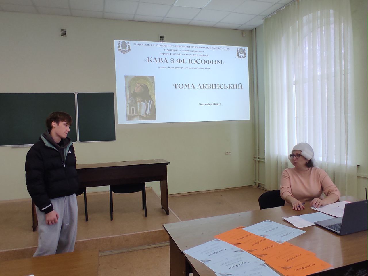 Кислюк Катерина відтворила філософію Фрідріха Шеллінґа, показавши глибину його міркувань про природу, творчість та свободу духу. Костиріна Наталія розкрила концепцію філософської антропології Людвіга Фойєрбаха. Кандибка Павло в образі Томи Аквінського переконливо доводив як раціональне пізнання узгоджується з вірою, а Павлова Ангеліна предстала Зигмундом Фрейдом з його вченням про несвідоме як визначальним чинником людської поведінки. Чередніченко Дар'я через Сократівський принцип "Пізнай самого себе" стверджувала, що справжня мудрість і моральне вдосконалення починаються з усвідомлення власної природи, мотивів і меж.