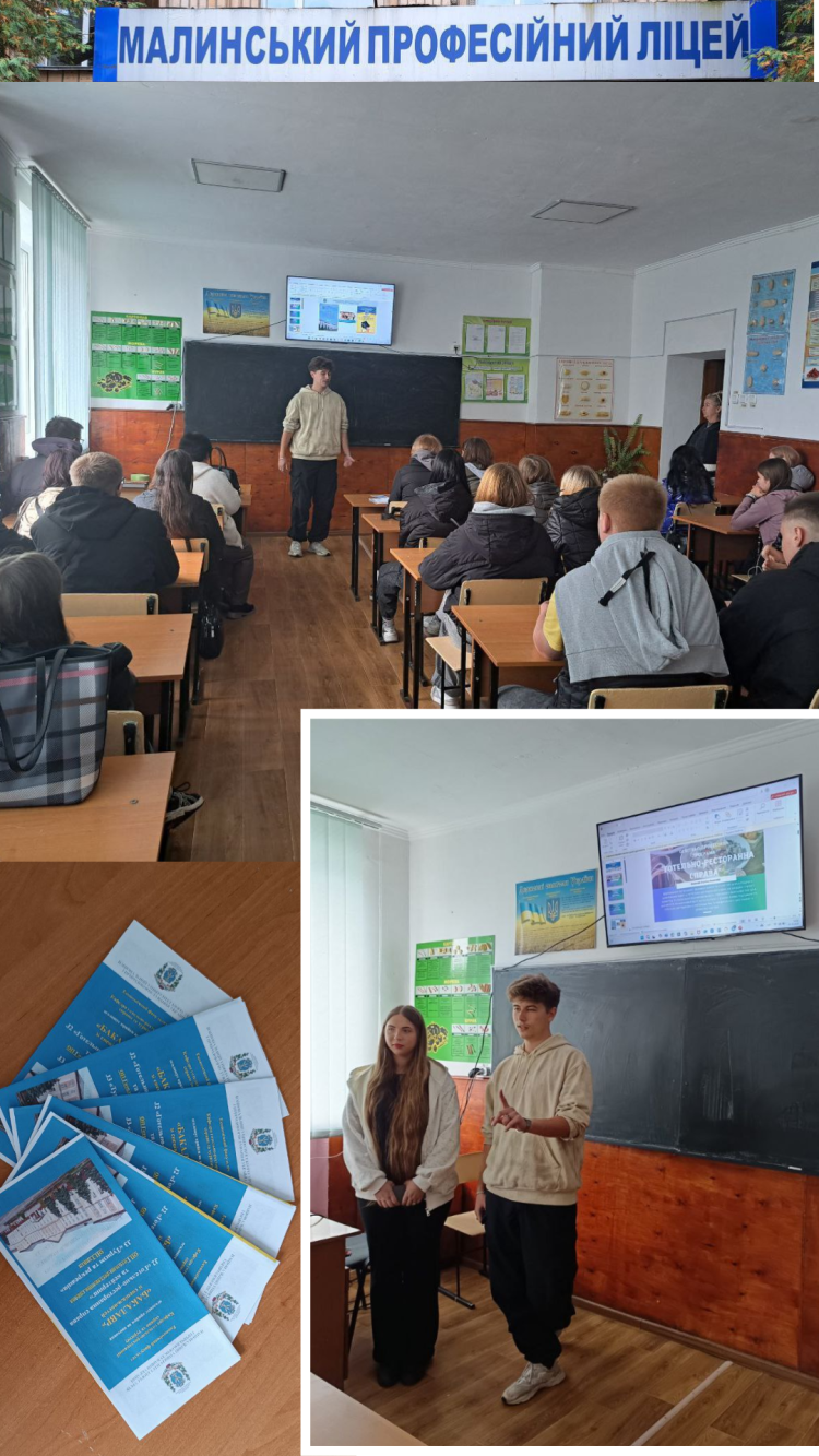 Так, на запрошення викладачів державного навчального закладу «Малинський професійний ліцей» (м. Малин, Житомирська область) — Людмили ШЕВЧУК, Олени ДАНИЛЬЧУК та Любові КУЛІНІЧ — доцент кафедри Наталія БУНТОВА разом зі студентами Дмитром МЕЛЬНИЧЕНКО та Мариною КЛИМЕНКО провели профорієнтаційний захід для учнів 3 випускного курсу, що навчаються за професією «Кухар; офіціант». Детально розповіли про всі переваги навчання в Національному університеті біоресурсів та природокористування України: підкреслили особливості освітнього процесу, можливості для самореалізації та розвиток soft skills під час навчання за обраною освітньою програмою, широкий вибір місць проходження практики та можливості стажування за кордоном. Запросили відвідати День відкритих дверей та майстер-класи, які проводить кафедра готельно-ресторанної справи та туризму.