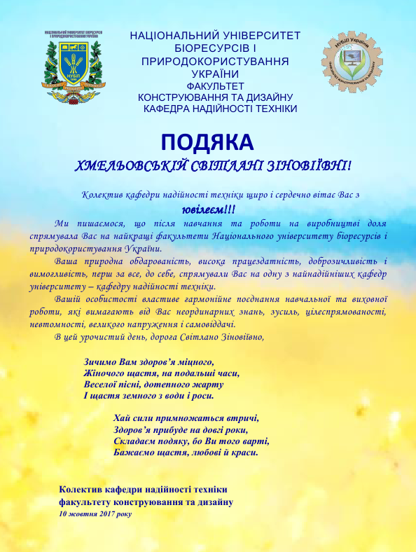 Колектив кафедри надійності техніки щиро і сердечно вітає з ювілеєм!!! ХМЕЛЬОВСЬКУ СВІТЛАНУ ЗІНОВІЇВНУ! вт, 10 жов 2017 - 03:00