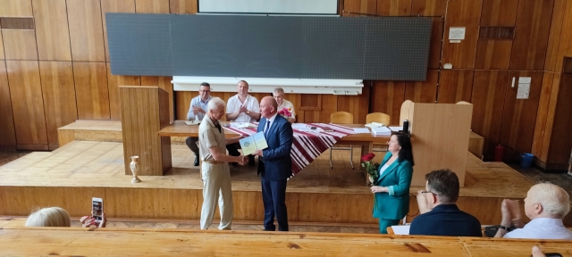 На знак вшанування багаторічної сумлінної праці декан механіко-технологічного факультету Вячеслав Братішко вручив майстру виробничого навчання кафедри охорони праці та біотехнічних систем у тваринництві Савицькому Олександру Пилиповичу диплом «Заслужений працівник НУБіП України».